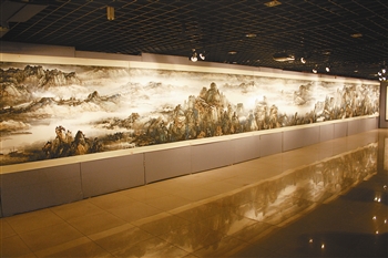 由天津著名實力派畫家劉皜創作的巨幅山水畫作《江山萬古雄》今起在鼓樓淘寶軒展出,其畫作長20米、寬1.4米。全畫以山水風光為景,遠觀山勢雄壯、雲氣繚繞、氣勢磅礡,近看細節精致、脫俗瀟灑,韻味悠長,頗具視覺震撼,特別是畫面中的山川、船塢、樹木、房捨,流動著中國山水畫之意境,繚繞的祥雲使畫面飄逸生動,在悠遠神秘蒼勁之中透出一股奇秀。